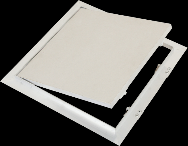 Plechová dvířka 400x400mm bílá s povrchovou úpravou. US zámek svou konstrukcí vhodnější pro použití do příček a pro větší formáty dvířek (tlačný zámek).